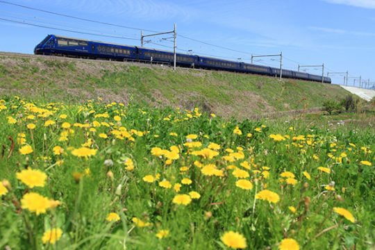 東へ帰るロイヤルエクスプレスを土手に咲くタンポポがお見送りをしていました。...