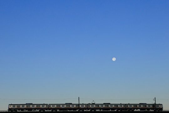 早朝の満月、ローカル電車を見下ろして…八高線の情景〔今日の一枚・2025年12月8日セレクト〕
