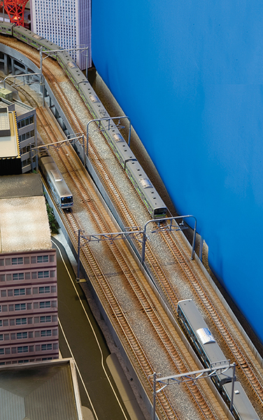 DSC_1461 奥側の直線区間は一見複々線のようにも見えるが、実際は同じエンドレスの外周と内周が並列になっている。しかも勾配が交差する形なので、相互が平坦で揃うことはない。 【この画像の記事に戻る】 予算は1万円!「100均」製品をフル活用して都会型Nゲージレイアウトを作る! 前の画像 次の画像