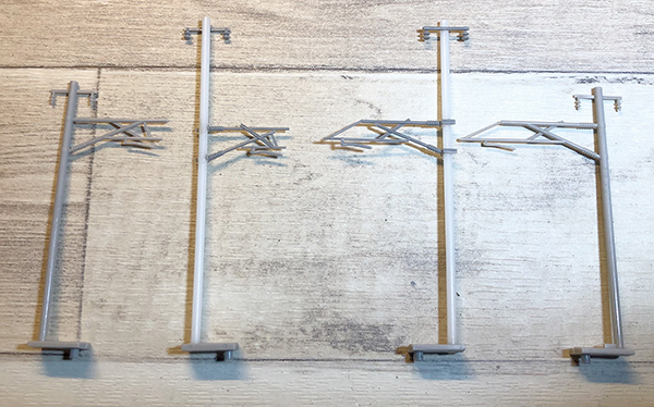 ︎交流用の架線柱は、φ0.2のプラ丸棒で自作(写真中央)。ベースとビームだけTOMIXから移植している。厳密に言えば柱上部の腕金や、き電線の配置など、交流と直流で構造を作り分ける必要があるが、今回は簡素かつ明確に示すことを優先したので省略した。