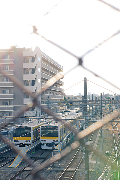 西陽を受ける中央・総武線のE231系500番代を跨線橋から見る。 ‘23.11.23 東京都三鷹市 三鷹跨線人道橋 P:東條ともてつ