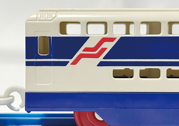 nayu08 「NSマーク」のアップ。X0編成の海側で試用された「帯の幅と同じサイズ」のNSマークが表現されている。 【この画像の記事に戻る】 短命だったプラレール「ライト付」の100系新幹線 貴重な初期の姿とその後 前の画像 次の画像