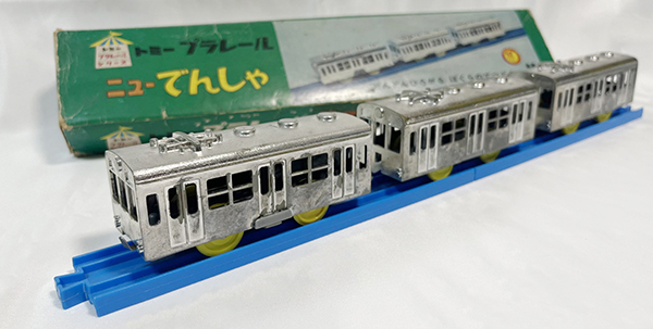 pladen_04 銀メッキが眩しい「ニューでんしゃ」は国鉄301系がモデルと思われる。 【この画像の記事に戻る】 全てはここからだった?プラレール通勤型電車規格の礎を築いた「電動プラ電車」とは? 前の画像 次の画像