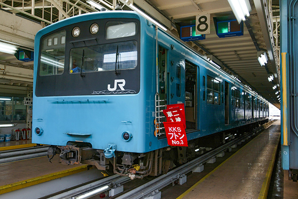 中央・総武線から転入してきた201系の中には中間に試作車900番代が組み込まれている編成もあった。戸袋窓の形や運行番号表示器廻りの色、前面車体裾の形状から違いは多岐にわたる。 クハ201-901 ’04.6.2 東京総合車両センター P:松沼 猛