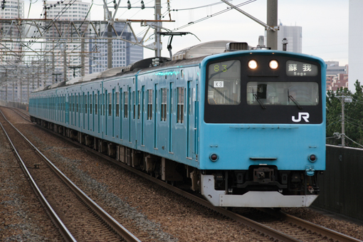 シングルアームのPS35C形パンタグラフに換装されたケヨK3+53編成。同様のパンタグラフに換装されたのは他にケヨ52+K2編成が該当する。なお、当時残っていた他の分割編成であるケヨ51+K1編成や、ケヨ54+K4編成には波及しなかった。 ‘09.3.28 京葉線 市川塩浜 P:岩片浩一 (鉄道投稿情報局より)