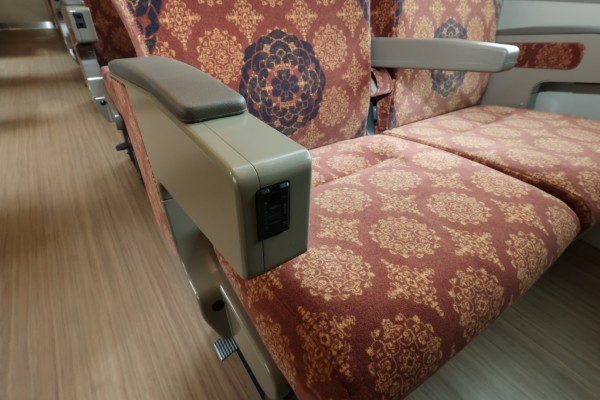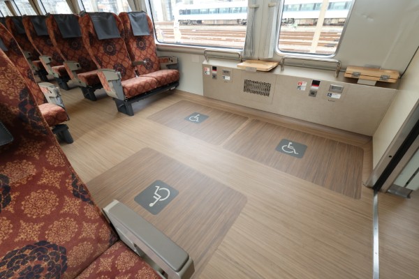 車内ではシートのモケットを外装に通じるえんじ色に文様をプリントしたものに交換。全席にコンセントが設置され車内Wi-Fiも完備されます。大型荷物置場や3席分確保された車椅子スペースなども設置され、内外からの観光客の様々なニーズに応えています。