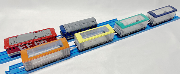 carnayu_12 「EF65 カートレイン」のもの。レインボー色のEF65が文字通りレインボーの貨車を牽くという、洒落の効いた製品。 【この画像の記事に戻る】 よく考えるとマニアックな車種チョイス 実は歴史が長いプラレールの「車運車」たち! 前の画像 次の画像