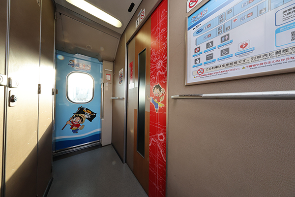 4S9A7778 乗降扉をはじめとしたデッキのいたるところにもイラストが描かれており、世界観を演出している。 【この画像の記事に戻る】 【700系がブルーに!】4月12日から運行開始される「ワンピース新幹線」がついにお披露目! 前の画像 次の画像