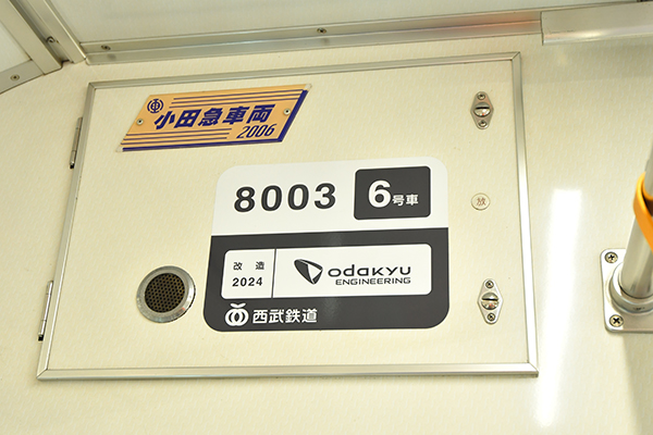 DSC_1255 車端部の車番ステッカー。もちろん改造に関わった小田急のロゴもここに入る。 【この画像の記事に戻る】 【ついにお披露目】元小田急の西武鉄道8000系「サステナ車両」その全貌がいよいよ明らかに! 前の画像