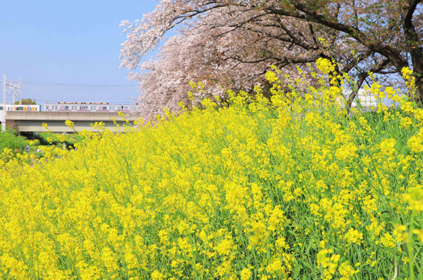 ●春爛漫の黒目川橋梁を行き交う東武東上線