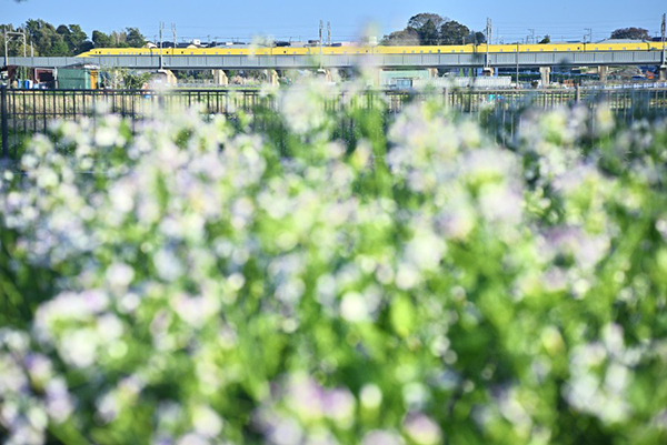 ●可憐な花の向こうを上り「ドクターイエロー」が通り過ぎました。