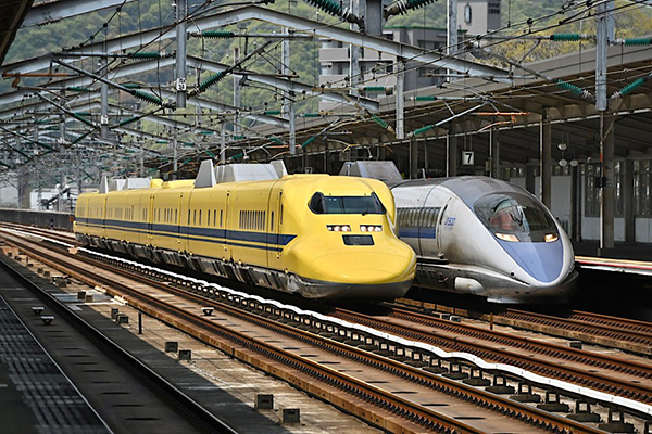 ●先着で通過待ちの500系「こだま」の横を「ドクターイエロー」が風のように通り過ぎて行きました
