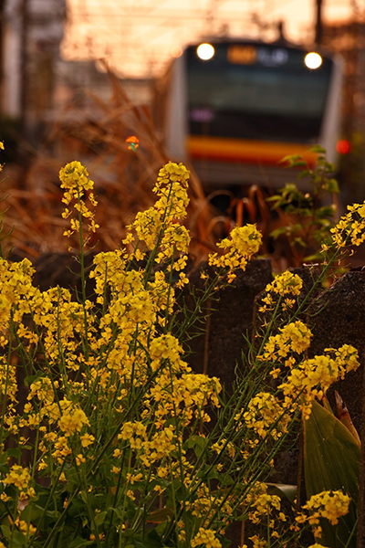 ●きれいに咲いた菜の花の向こうに、南武線のラインカラーが覗きます。