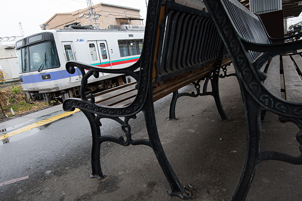 ベンチ越しに800形を見る。元京王3000系の700形とともに、上毛電鉄の顔になっていくことを期待したい。