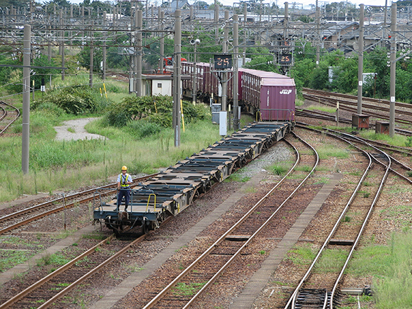 貨車を仕分け線へ押し込んだ後は別の番線へと忙しく動く。デッキには無線を持った係員が添乗している。