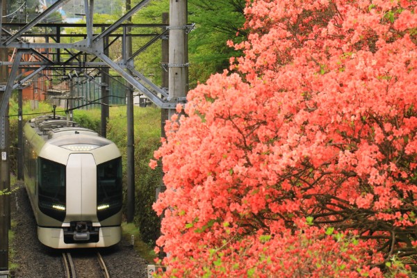 満開のつつじの前で、南武線のラインカラーがすれ違い。