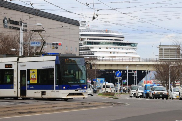 JR函館駅近くの若松埠頭にクルーズ船が入港すると新しいホテルがオープンしたように見えます。