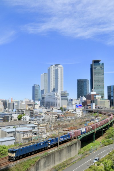 青空の下を青い機関車の重連が名古屋のビルを背に走る。