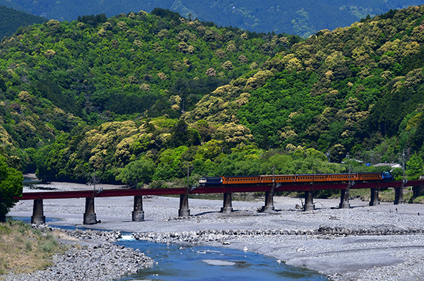 ●国鉄色になったED31とオレンジ色の旧型客車が初夏の大井川上流の新緑にひときわ映えました。