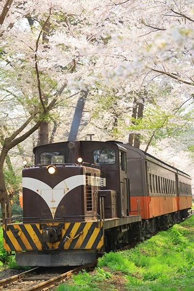 ●桜のトンネルを抜けてきたのはディーゼル機関車牽引の客車列車でした。