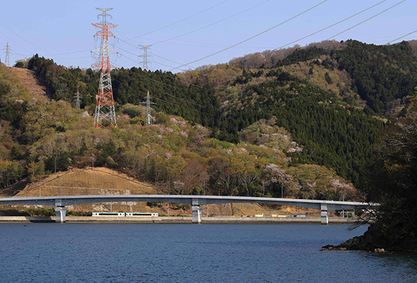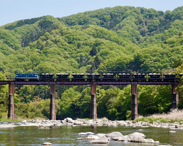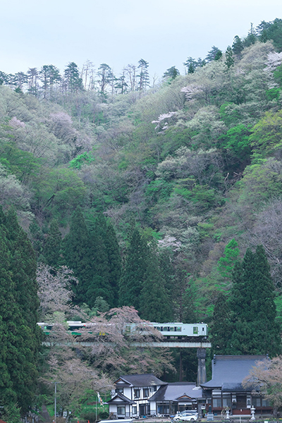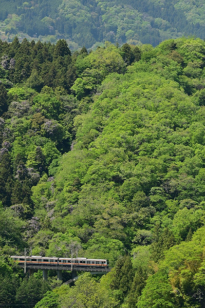 ●若葉萌える山間を、東京行きの電車が走り抜ける。