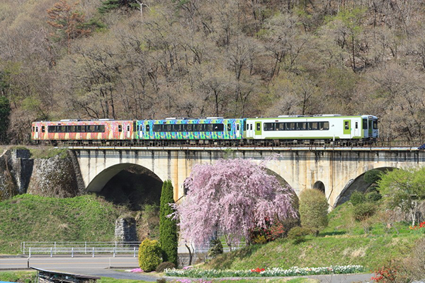 ●この地限定のカラフルなキハ110の3連が、しだれ桜が見頃のめがね橋を渡ります。