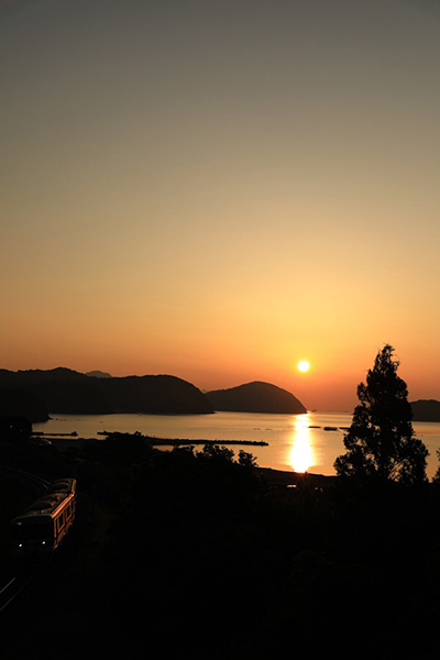 ●昇ったばかりの太陽の光を、僅かに反射させた始発列車が行きます。