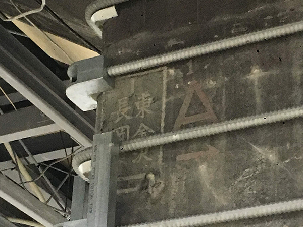 玉造駅のリニューアル工事中に化粧板を外した際に露出した柱の写真です。駅名のような地名が読み取れます。これはいったい何の表記なのでしょうか。