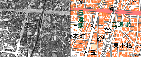 ▲左側が1945~1950年の空中写真。右側が現在の地図。