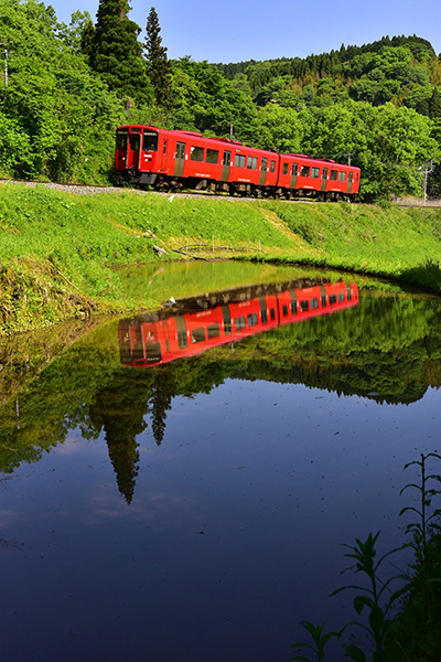 ●青い空、新緑の山、水の入った田んぼに朝日を浴びて映る赤いキハ。田植えの季節ならではグラデーションに、早起きして出かけた甲斐がありました。