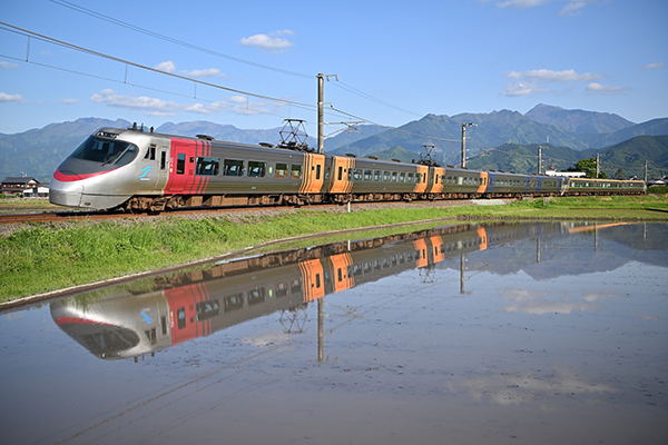 ●水が張られたばかりの田んぼに、「ウルトラマンラッピング」の3000系がやってきました。