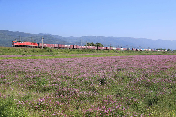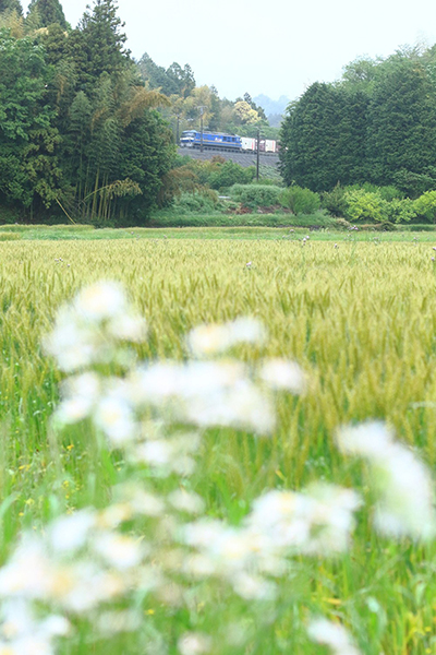 ●5月晴れの朝に蓮華草が綺麗に咲き誇り、赤ゴトー貨物が気持ち良さそうに駆け抜けた。