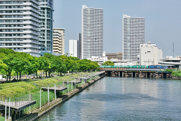 ●水辺にそびえるタワーマンション群の下をタキ牽引の「ブルーサンダー」が姿を現しました。