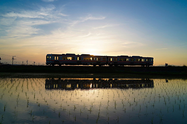 ●夕暮れの水田リフレクション、鳥羽駅に向かう「キハ25形」。
