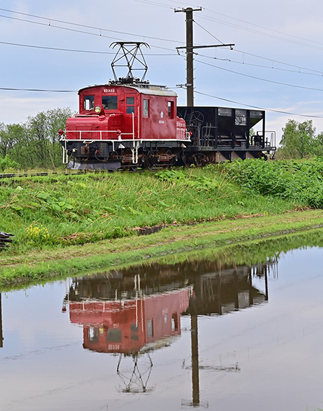●弘南線沿線も稲作の時期を迎え、そこかしこの田んぼに水が引き込まれ始めました。ロケハンしながら線路際の水田を探し見つけたポイント。今なお現役の古豪ED333をうまくとらえることができました。