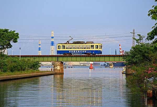 ●日本のベニスと称される港町「内川」をレトロな電車が通ります。
