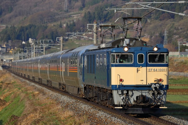 tjk-602565 快晴の篠ノ井線を行く「カシオペア紀行」。美しい光線がEF64 1001号機とカシオペアを浮かび上がらせる。 ‘22.4.17 篠ノ井線 稲荷山~篠ノ井 P:前川昌廣 (鉄道投稿情報局より) 【この画像の記事に戻る】 【まもなく引退】寝台特急「カシオペア」を牽引した名機関車たちを振り返る! 前の画像 次の画像