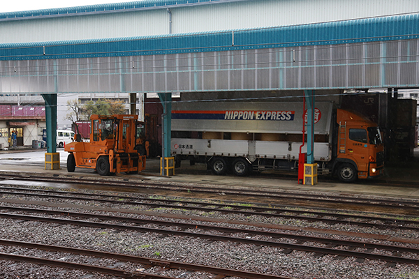 10 トラックが到着前に荷役ホームに待機している。中には紙パルプと思われるものが確認できる。 【この画像の記事に戻る】 JR貨物のEF65が来ていた四国の「伊予三島大王製紙専用線」そこでは往年の鉄道シーンが再現されていた! 前の画像 次の画像