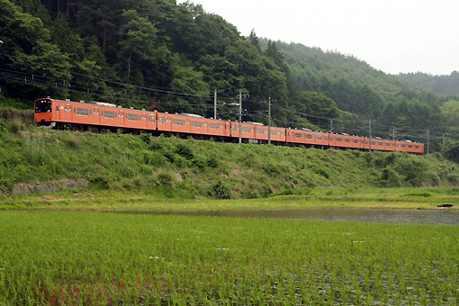 青梅・五日市線用の青3編成と、クハ201-1を除くH1編成のトップナンバー3両による変則7両編成で廃車回送された時の様子。中間に挟まる先頭車(クハ200-1)が印象的。 ‘08.6.19 中央本線 すずらんの里―青柳 P:井田幸宏 (鉄道投稿情報局より)