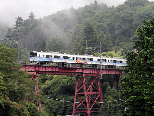 201系唯一の観光列車(ジョイフルトレイン)の四季彩。当時あまり例のなかった通勤型による観光列車で、内装にも手が加えられていた。この塗装は後年のデザインとなる。 ‘08.8.17 青梅線 二俣尾―軍畑 P:田中 友 (鉄道投稿情報局より)