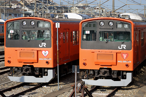 2010_03_14_miyagi_hiroshi001 晩年、30周年記念ステッカーを貼り付けたH4編成とH7編成。中央線201系で最後に残った2本だ。 ‘10.3.14 豊田車両センター(敷地外より撮影) P:宮城浩志 (鉄道投稿情報局より) 【この画像の記事に戻る】 いよいよ完全引退へ「省エネ電車」関東と関西 201系がまとった4色のカラーリングを振り返る 前の画像 次の画像