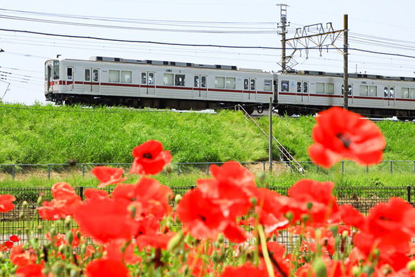 ポピーが咲く沿線。まるで東武鉄道の花道を演出するかのように並行して咲き誇っていました。