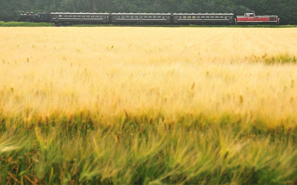 黄金色の麦畑をDL牽引の客車列車が通り過ぎていきました。