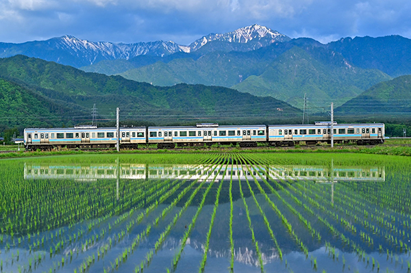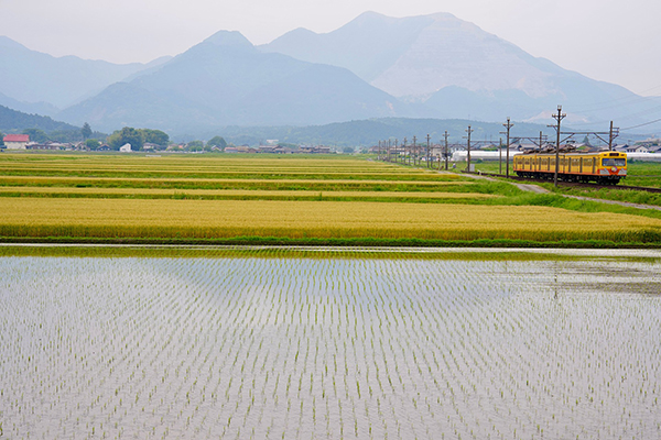植えたばかりの苗が水面に並び、ギラリと光る列車が駆け抜ける