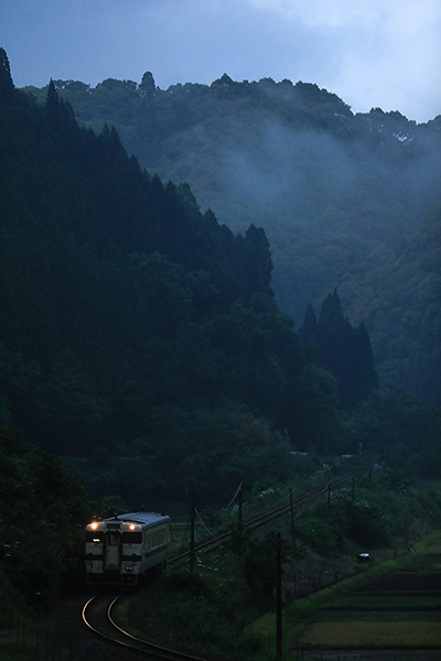 夕闇迫る頃、湿った空気が満ちる山あいに気動車の警笛が響きます。