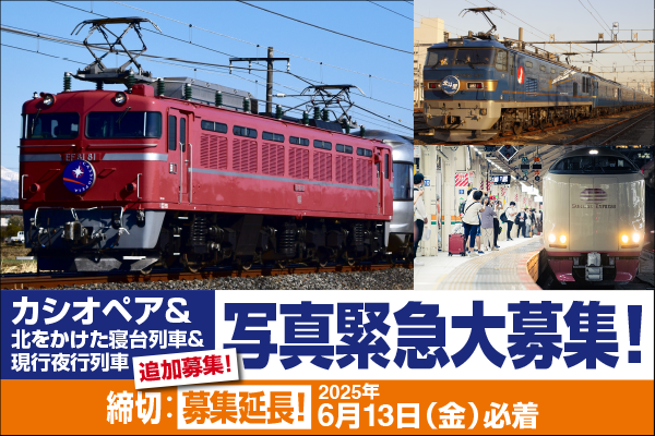 上記の本に掲載する写真をただいま鉄道ホビダスでは代募集中!メインとなる「カシオペア」に加えて、「北斗星」や「トワイライトエクスプレス」など、「カシオペア」に影響を与えた列車たちの写真も追加募集中!応募は下記バナーから!