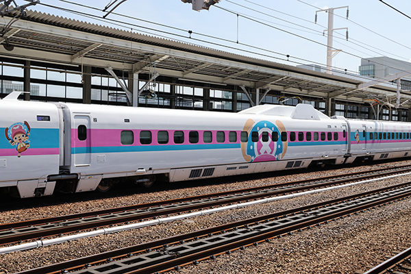 cp_2 「トニートニー・チョッパー号」2号車デザイン。以降偶数号車にはこの「チョッパー」をイメージしたデザインが車体中央に描かれる。 【この画像の記事に戻る】 【ピンクと水色の700系!】「ワンピース新幹線」第2弾「チョッパー号」運行開始! デザインをチェック! 前の画像 次の画像
