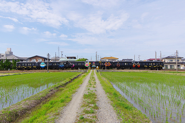 ●今年は裏年で稲の作付けをする田んぼが少なく、視点を変え413系(とやま絵巻)のラッピングデザインとシンメトリーを強調してみました。