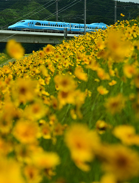 ●毎年咲き誇る黄色い土手に新顔の青色新幹線が駆け抜けます