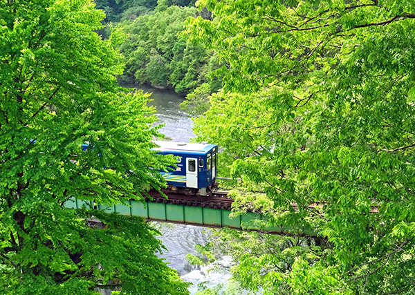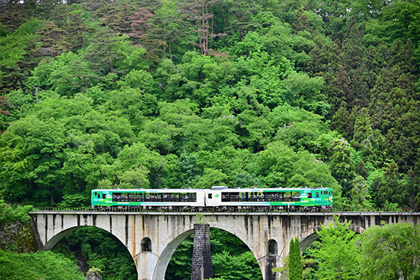 ●沢山のお客を乗せ、めがね橋を渡る「風っこ遠野号」。